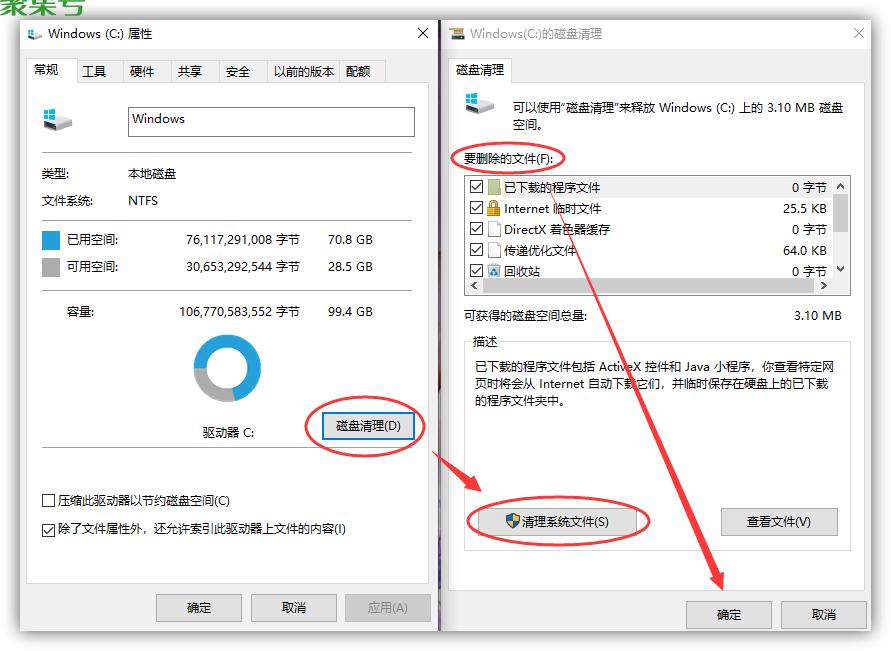 打开新的面板后,点击「磁盘清理」,先选择「清理系统文件」,清理完成后,勾选要删除的文件,点击「确定」就可以删除了。