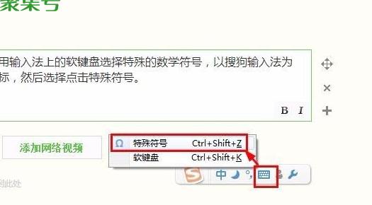 2、还有我们还可以使用输入法上的软键盘选择特殊的数学符号,以搜狗输入法为例,点击软件盘图标,然后选择点击特殊符号。