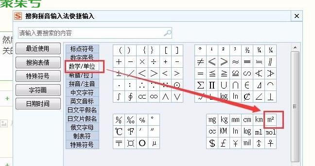 3、然后在打开的特殊符号窗口中选择数学/单位符号,就可以在右侧看到和数学相关的符号,而我们要使用的平方米符号㎡也是有的。