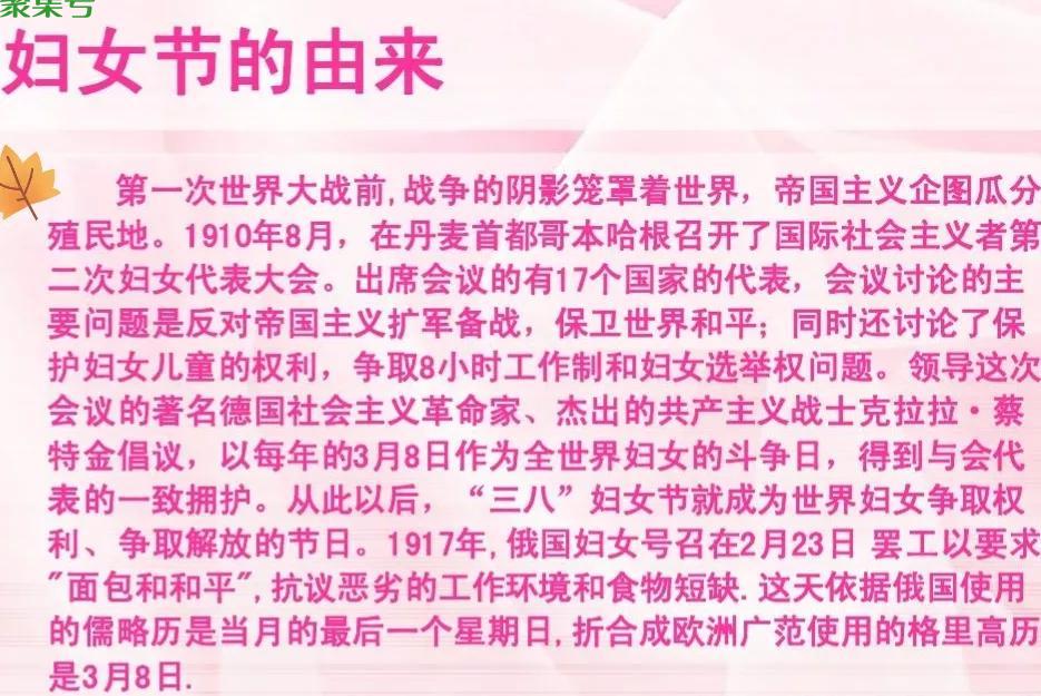 从此以后“38妇女节”就成为世界妇女争取权利,争取自由解放的日子。