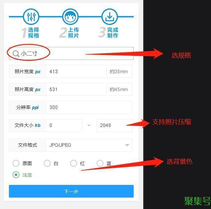 3、里面有很多照片规格,可以搜索找到“小二寸”规格,点击下一步再上传照片即可