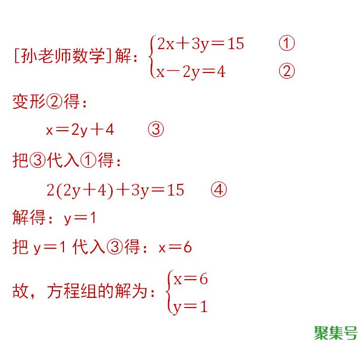 第一步:变形方程②,用含有y的代数式表示出x,见③;当然,你也可以用含有x的代数式表示出y。