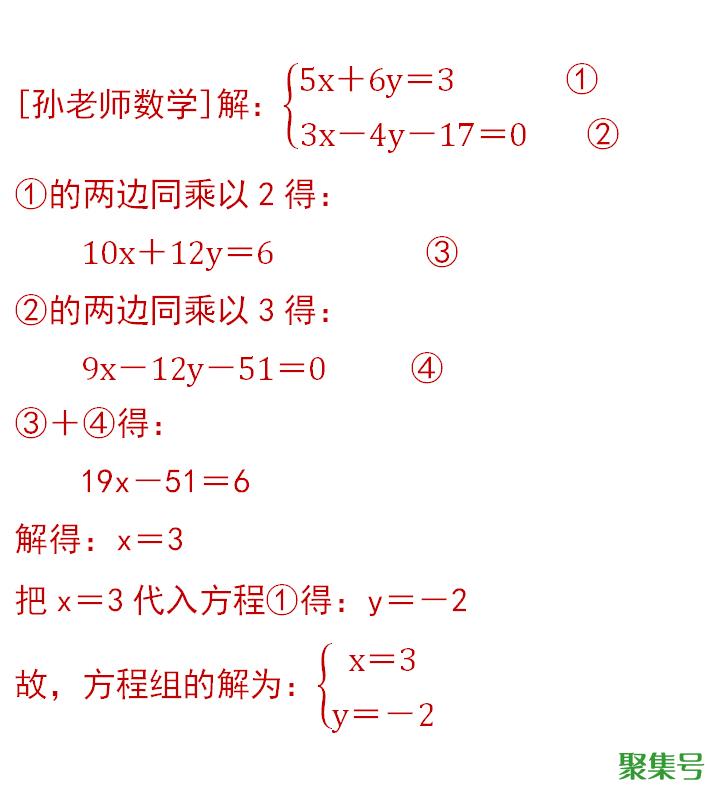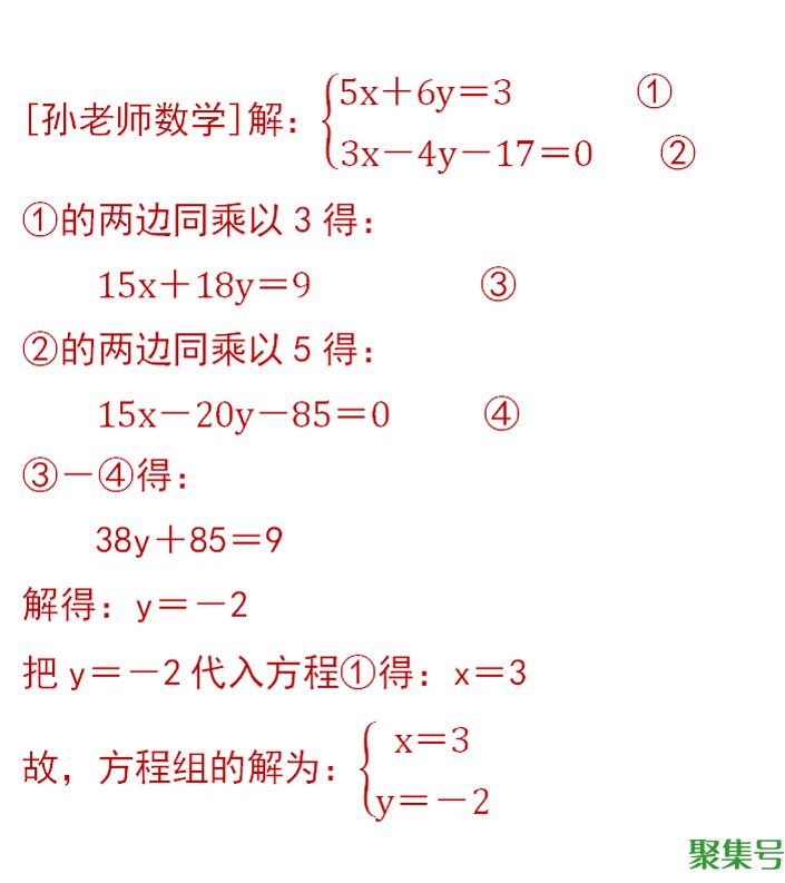 第一步:变形两个方程,x的系数是3和5,它俩的最小公倍数是15,故可以把x的系数都变成15,详细见③和④。