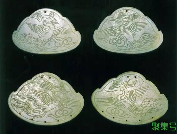 【凤纹玉珩】明代,长8厘米,宽5.4厘米,现藏于首都博物馆,一块玉料琢制成4件玉珩,扁片云头形,正面均阴刻飞凤,展翅于祥云之上,以短阴刻线示羽毛,凤尾后扬,背面一对光素,一对阴刻如意云纹,玉珩佩连接上,下端的饰物。