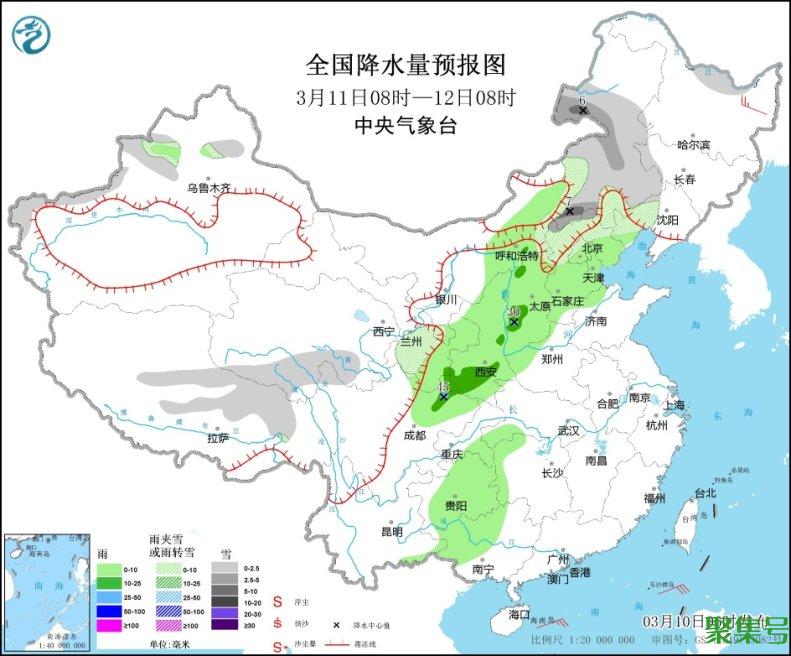 图2 全国降水量预报图(3月10日08时-11日08时)