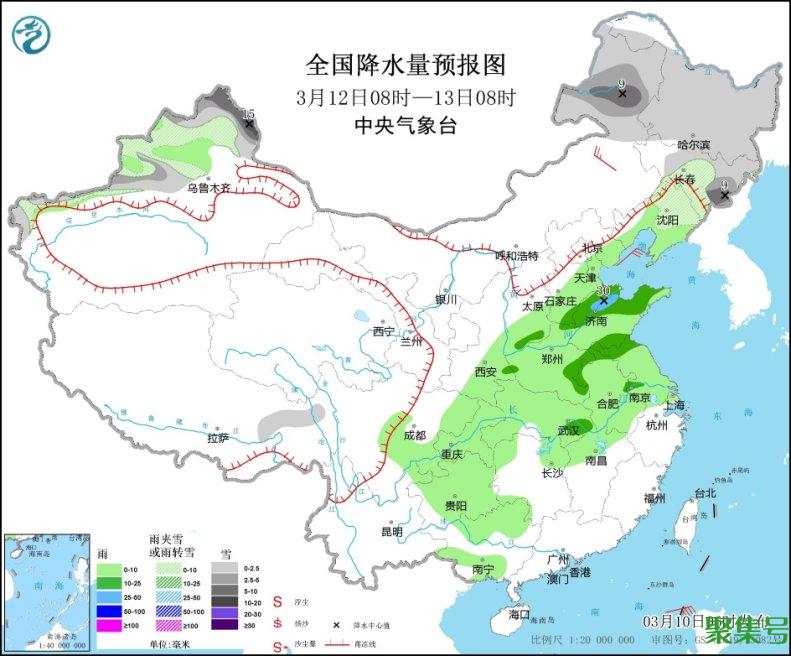 3月12日08时至13日08时,内蒙古东部、东北地区大部、新疆北部等地部分地区有小到中雪或雨夹雪,其中,内蒙古东北部、吉林东部、新疆北疆北部等地部分地区有大到暴雪(10~15毫米)。辽东半岛、河北南部、天津、山西南部、陕西东南部、河南、山东、江苏、安徽、湖北、江西北部、重庆、四川东部、贵州、广西北部和南部等地部分地区有小到中雨,其中,山东北部部分地区有大雨(25~30毫米)。内蒙古中部部分地区有4~5级风(见图4)。