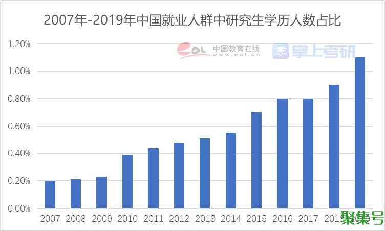 《报告》还指出,伴随就业竞争的加剧,高等教育的普及化,我国用人单位对从业者学历要求越来越高,具有研究生学历的就业者比例也稳步上升——从2007年占比0.2%到2019年上升至1.1%,即每100名就业者中就有1名拥有研究生学历。