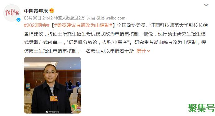 据中青网报道,全国政协委员、江西科技师范大学副校长徐景坤建议,将硕士研究生招生考试模式改为申请审核制。他说,现行硕士研究生招生模式录取方式较单一,“仍是唯分数论,人称‘小高考’”。