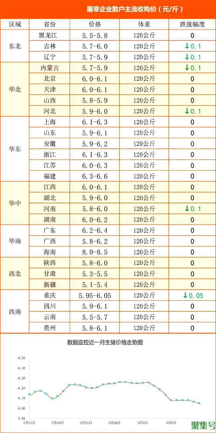 据了解,2022年3月14日,屠企报价,国内生猪价格继续震荡走跌,全国生猪均价跌至6.05元/斤,猪价震荡偏弱,在国内市场,猪价延续了磨底的表现!北方部分地区,猪价窄幅下跌,比如说,吉林、辽宁以及内蒙地区,屠企报价下跌0.1元/斤,国内北方市场,猪价普遍跌破6元/斤,黑龙江低价猪源触底5.5元/斤!而在南方市场,猪价也不尽人意,南方大部行情跌至5.5~6.6元/斤左右,云贵以及四川、安徽、山东、河南以及湖北等地,猪价也陆续跌破6元/斤,而在国内大部市场,猪价延续了底部横盘的表现!