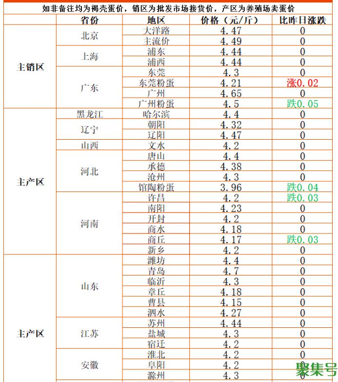 目前,北京市场,鸡蛋批发均价达到了4.47~4.49元/斤,上海市场鸡蛋批发均价4.44元/斤,而在广东部分市场,蛋价冲高4.65元/斤!而在养殖场,河北山西等地,养殖户鸡蛋卖价维持在4.2~4.4元/斤,山东地区,蛋价普遍在4.17~4.4元/斤,在青岛地区,受散发病例影响,蛋价达到了4.7元/斤!