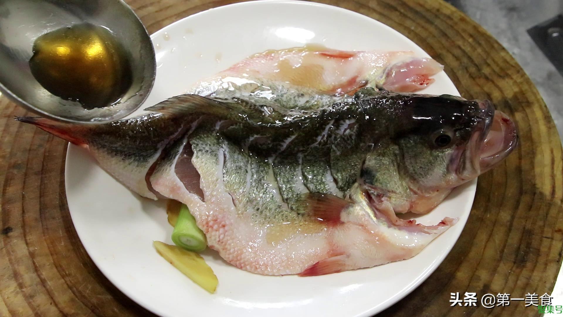 5.6分钟之后,鱼已经蒸熟,清香鲜嫩,把鱼从锅中取出,倒掉汤汁,挑出葱姜,汤汁比较腥,一定要倒掉,撒上准备好的葱姜丝。
