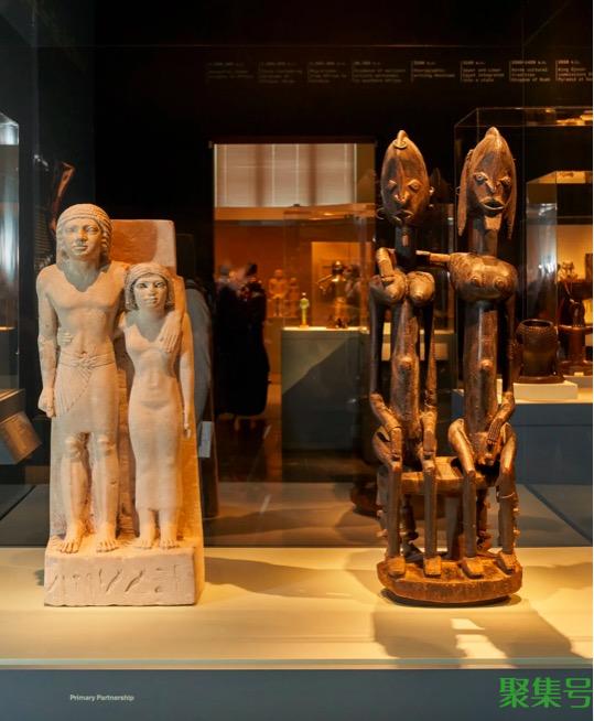 19世纪初,马里的“坐着的情侣”(右)和来自埃及的“梅米和萨布”(约公元前2575-2465年)在同一个展柜中。 摄影:Seth Caplan
