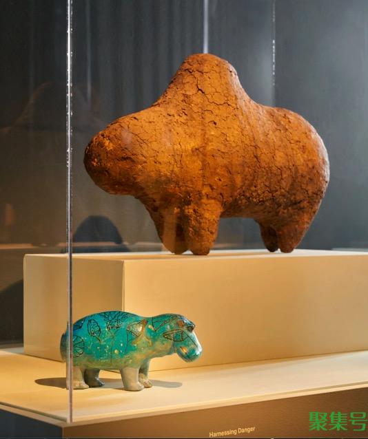 一个用混合了酒精和血液的泥土制成的河马形物体来自20世纪的马里,与它放在一起的是河马彩陶俑,这头被亲切地称为“威廉”的小河马是古埃及第12王朝总督森比(Senbi II)墓葬出土的一对河马彩陶俑的其中之一。古埃及河马型陶俑出土众多,唯独这只河马身上有着完整的莲花花纹,这也展现了古埃及人眼中的大自然。