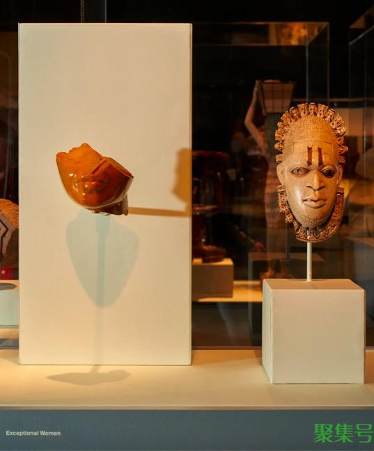“杰出的女性”部分:来自埃及的“女人脸的碎片”,约公元前1353-1336 年和 16 世纪来自贝宁的“太后吊坠面具”。