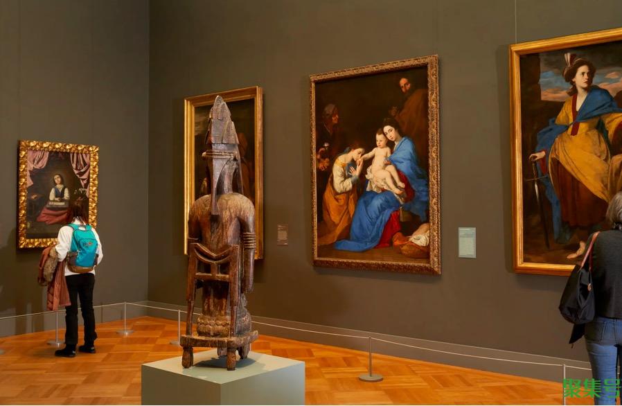 展览还延伸至博物馆其他空间,比如,一个圆睁双目的刚果人物似乎扰乱了希腊和罗马展厅的和平。一列埃塞俄比亚游行队伍漂浮在中世纪大厅中。在欧洲展厅,一尊被人们尊称为“关丹苏”(gandansu)的马里母亲木雕正望向朱斯佩·德·里贝拉创作于1648年的不朽画作。
