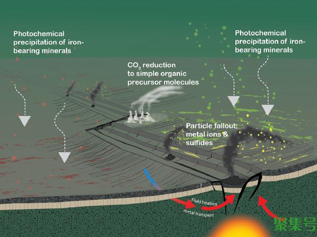 这一假想的地球早期海底场景描绘了一个大洋中脊扩张中心,“黑烟囱”在这里释放高温热液,金属离子和硫化物(黄点)与较冷的海水相互作用,在海底形成沉淀物。图中还显示了“白烟囱”排放的冷却液体,各种碳酸盐和蛇纹石矿物组合从中沉淀下来,并可能产生氢,有助于有机化合物的非生物合成。由于溶解铁的存在,海洋主要呈绿色。上部水柱中的光化学作用导致溶解的铁氧化为不溶的铁相,如图所示为赤铁矿(红点)或“绿锈”(绿点)。