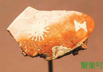上山文化彩陶是迄今所见世界上最早的彩陶,不少陶器及残片上带有神秘的纹饰图案。展柜里一件红色双耳陶壶,肩颈部有四组两两对应的白色点彩,看起来像是八卦纹。桥头遗址出土的一块夹砂陶片,在鲜红陶衣上,用白色颜料涂画了带有一周辐射短线的圆形,好似太阳纹,旁边还画着两个顶角相对的三角形。独特的纹饰勾起人们的遐想:这和远古的太阳崇拜有没有关系?