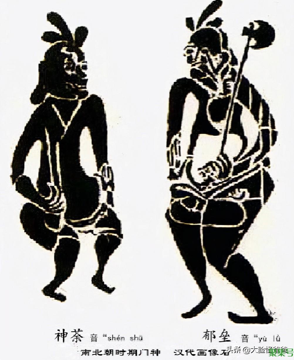 汉代王充的《论衡·订鬼》中说:“ 沧海之中,有度朔之山,上有大桃木,其屈蟠三千里,其枝间东北曰鬼门,万鬼所出入也。上有二神人,一曰神荼shēn shū,一曰郁垒yù lǜ,主阅领万鬼。善害之鬼,执以苇索而以食虎。於是黄帝乃作礼以时驱之,立大桃人,门户画神荼、郁垒与虎,悬苇索以御凶魅。