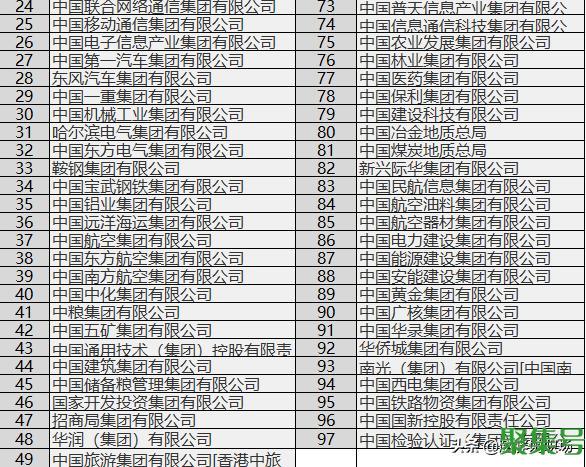 其中1-49号企业是由中央直接管理的副部级单位,由国资委企干一局管理;50-97号是由国务院国资委管理的厅局级单位,由国资委企干二局管理。