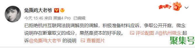 对于被起诉事件,该大V在其微博中表示:“我要是败诉了,其他公司依样学样,逐个封堵敢说真话的人,那天下网民还有言论自由吗?” 并称已拒绝杭州互联网法院调解员的调解,积极准备多方面的材料应诉,争取公开开庭。