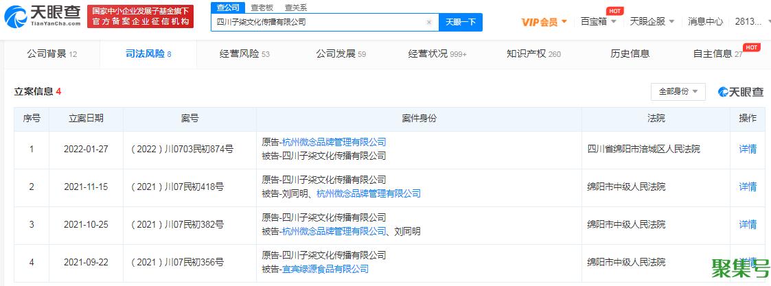 据天眼查数据,2021年10月和11月,四川子柒文化曾先后两次起诉杭州微念品牌管理有限公司、刘同明,经办法院为四川省绵阳市中级人民法院。另外,今年1月,杭州微念品牌管理有限公司已将四川子柒文化传播有限公司诉至四川省绵阳市涪城区人民法院,目前该案尚无更多进展。