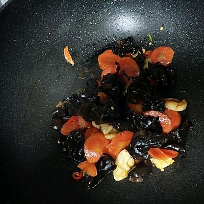 3、首先,油热姜蒜、小米椒爆香 ;依次下入胡萝卜片、木耳翻炒,加入耗油1勺半、 生抽1勺半