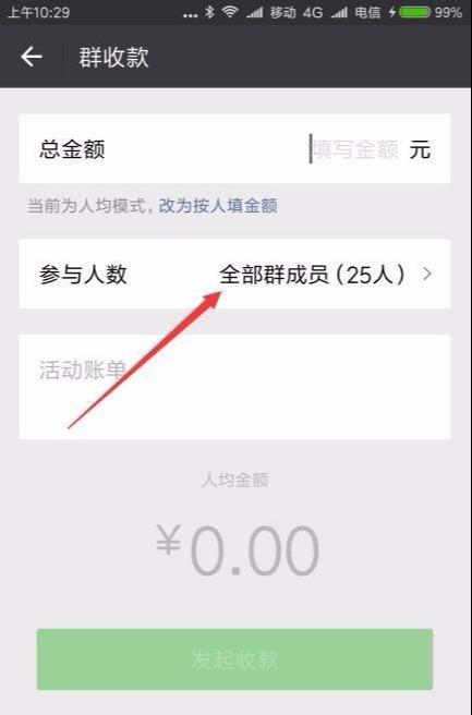 5、这时会打开“群收款”的设置页面,在这里输入收款的总金额,然后下面点击“参与人数”菜单项。(注意:默认模式是“人均模式”,也可改为“按人填金额”)