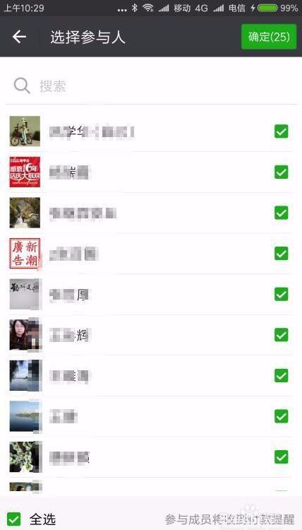 6、在弹出的选择参与人页面中,选择要参加聚会的好友后面的勾选。
