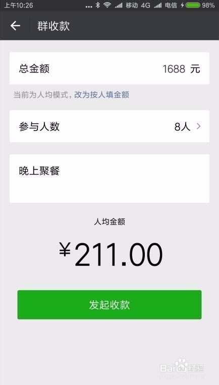 7、设置完成后,回到群收款页面,可以在备注里输入收款的详细信息,最后点击“发起收款”按钮即可。