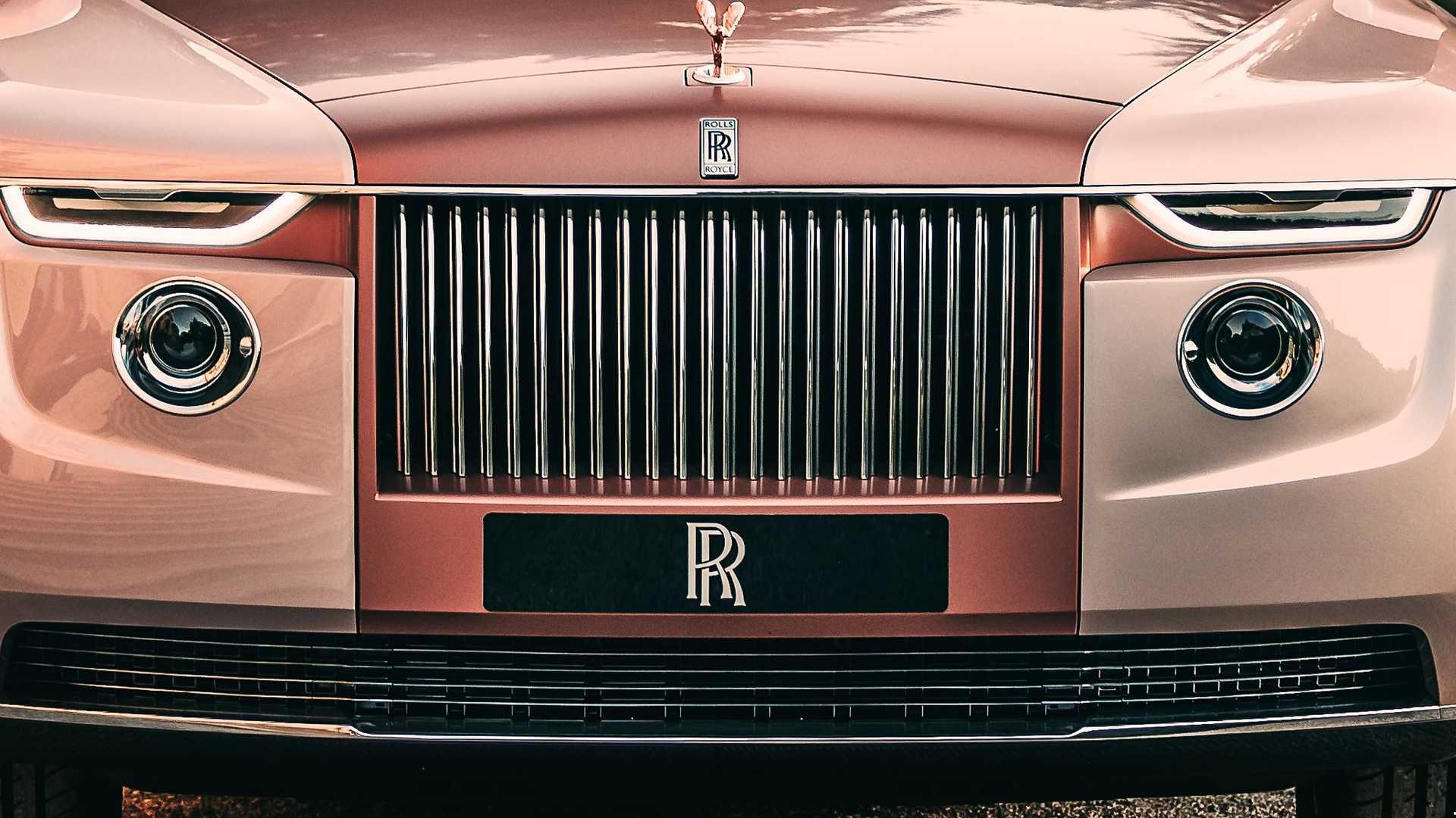 不锈钢制成的万神殿格栅是这款车中最具标志性的标志之一,但新款浮影的格栅与大家熟悉的劳斯莱斯设计语言不同,劳斯莱斯的工匠们将车身上的铝合金磨成比传统格栅更柔和的形状,然后将顶部和底部涂上了哑光的白兰地色调,使其消失在发动机罩和保险杠中,只留下抛光的铝合金叶片。格栅周围采用金铜色装饰。