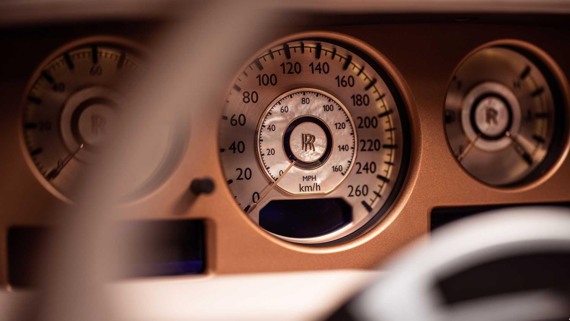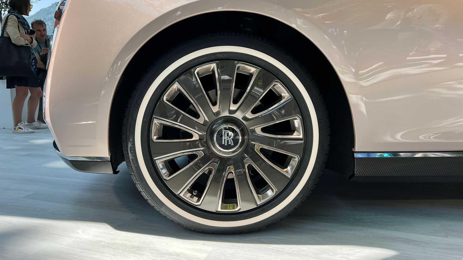 白色的轮胎壁,这些21英寸的固特异轮胎在侧壁边缘有一圈白色的涂装,为这款车提供意想不到的视觉效果。但不要让轮胎分散你对车轮的注意力,它们看起来很简单,但绝非如此。轮圈被镀上玫瑰金,然后在进行激光蚀刻之前涂漆以形成对比。劳斯莱斯表示,这种工艺以前从未在量产车上做过。它的额定时速为155英里/小时(249公里/小时)。