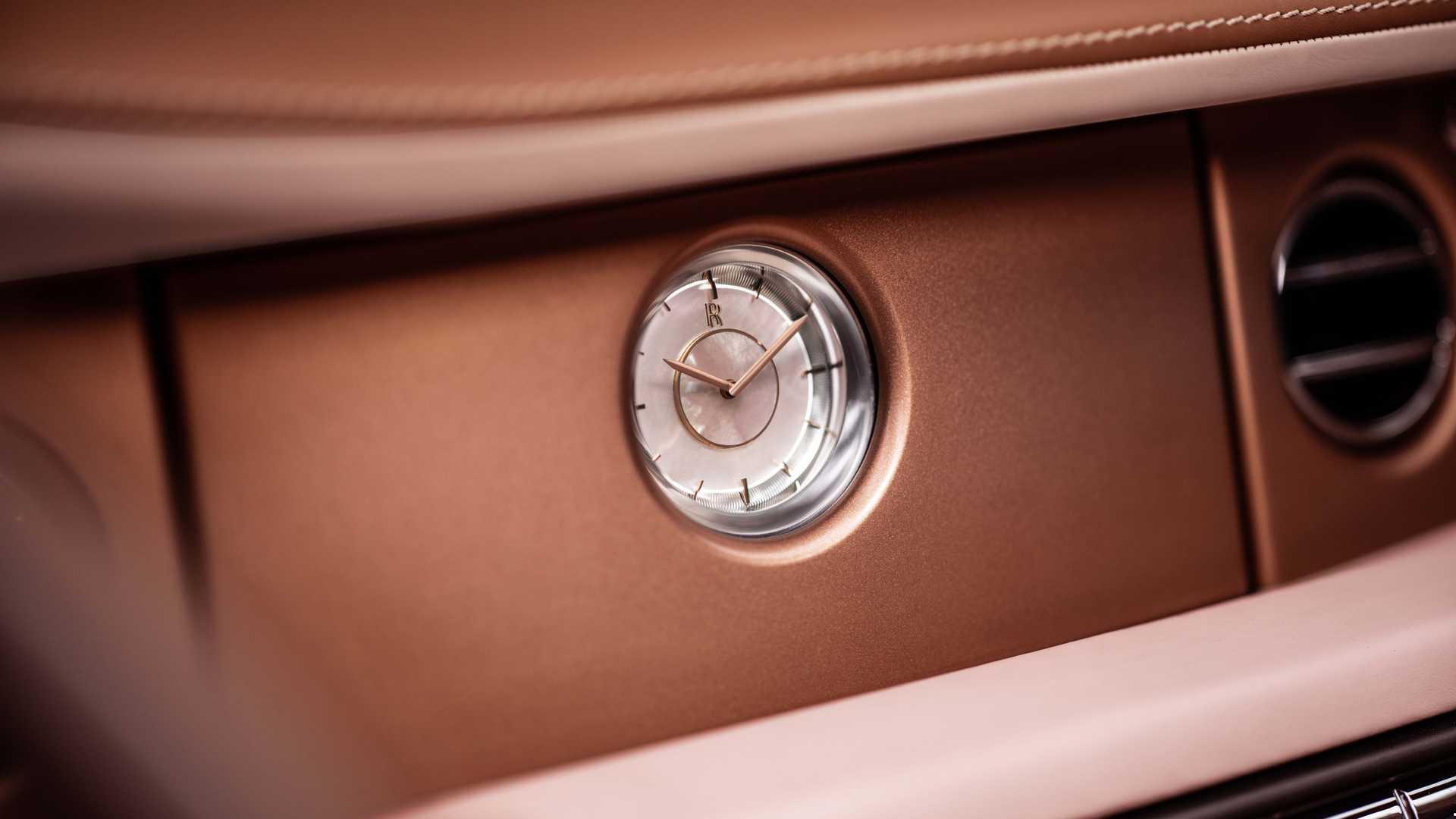 在浮影的车身采用了大量玫瑰金涂装,但并非所有细节都是如此,车主选择在门把手和A柱等一些部件上采用了镀铬装饰。以游艇为灵感的皇家胡桃木饰面和这些镀铬装饰相得益彰。