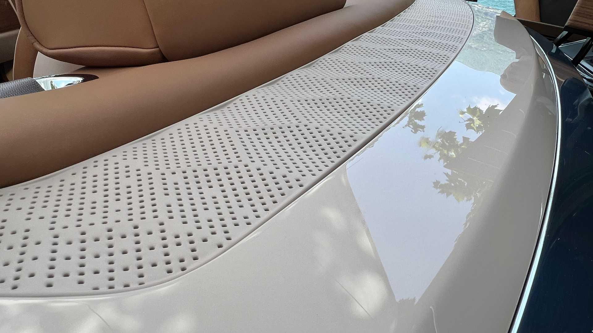 启动电动后甲板,木板像蝴蝶翅膀一样打开,露出所谓的“私家小厨房”。你会发现两排餐具,包括玻璃器皿,盘子,银器,当然,还有一个香槟冰柜。野餐桌可以伸展和旋转,将空间展开成一个饮食区域,还有一把遮阳伞。