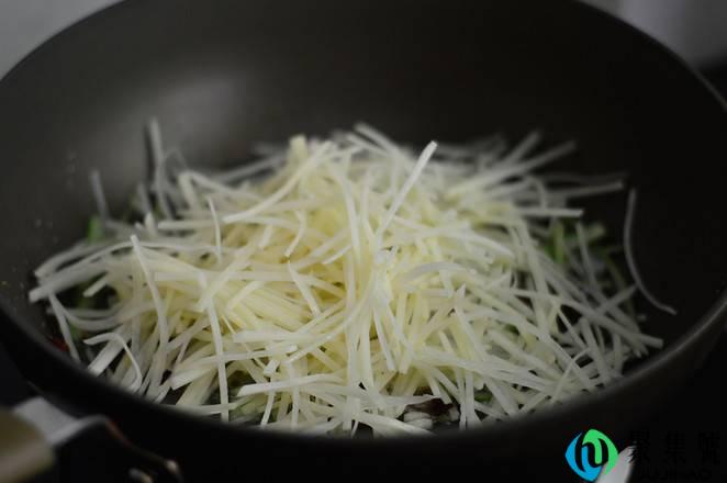 4、放入土豆丝,大火翻炒,淋入一汤匙白醋,炒匀。