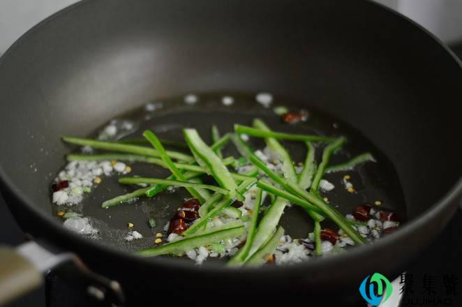3、锅里倒入少许油,爆香葱白、干辣椒和蒜沫,放入青椒翻炒。