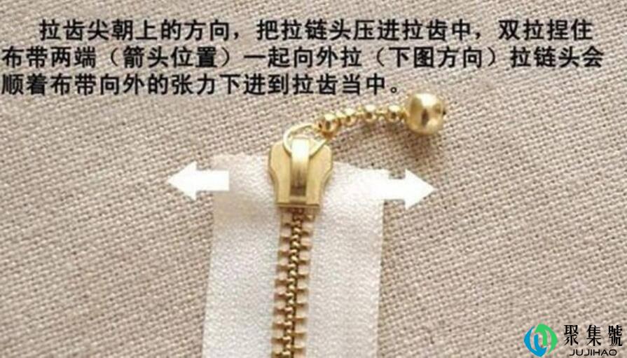 1、将拉链置于桌面程度朝上放置,拉齿间朝上,把拉链头拉进齿中,双拉捏住布带两头(箭头位置)一路向外拉(如图)拉链头会顺着布带向外的张力下进到拉齿中。布带拉出后拉头就拆上了。