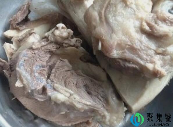 1、先把骨头洗净、放入锅中大火焯5分钟捞出来冲刷清洁,锅洗净之后、放入水和大料,还有姜片和骨头,烧开后,用小火煮45分钟捞出晾凉。