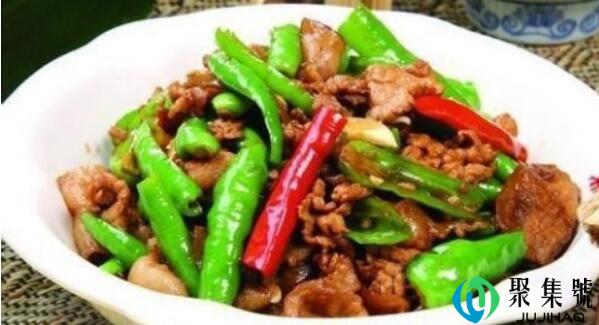 5、参加青椒,泡椒、米酒、生抽、煮骨头的汤焖3分钟、放点味精就能够出锅了。