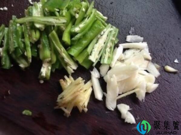 3、把姜和蒜洗净,然后姜切成丝蒜切碎。再把青辣椒洗净切成片。