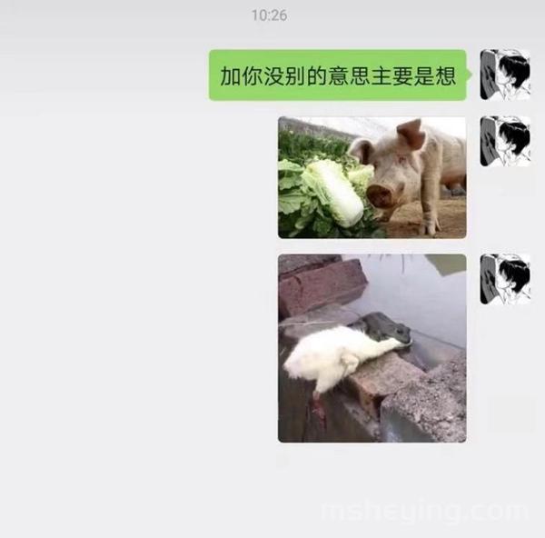最近在抖音上,有一个聊天对话是非常有趣的。一开始是给对方发了一句“加你没别的意思主要是想”,接着又发了两张表情包,一个是“猪拱白菜”、一个是“癞蛤蟆想吃天鹅肉”的表情包。最开始的时候很多人都不知道这个聊天对话是什么意思,之后有网友解释道:这其实是一个间接的表白方式,所表达的意思是是在向对方告白、想要和对方交往。