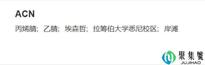 ACN在英语里面可做以下翻译:丙烯腈;乙腈;埃森哲;拉筹伯大学悉尼校区;岸滩等。