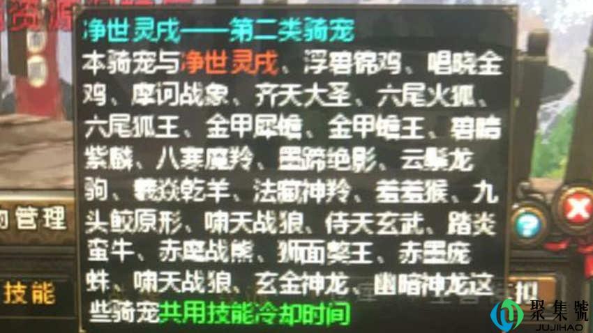 比如玩家可以打开净世灵戌的版面,点击左上角蓝色的问号,此时会显示本骑宠与浮碧锦鸡、唱晓金鸡、摩诃战象、齐天大圣、六尾火狐、六尾狐王、金甲犀蟾、金甲蟾王、碧睛紫麟、八寒魔羚、墨蹄绝影、云鬓龙驹、法藏神羚、羞羞猴、九头蛟原型、啸天战狼、侍天玄武、踏炎蛮牛、赤麾战熊、狮面獒王、玄金神龙、幽暗神龙这些骑宠共用冷却时间,所以它们共同属于第二类骑宠。玩家可以携带五只不同种类的骑宠来避免冷却时间共享。