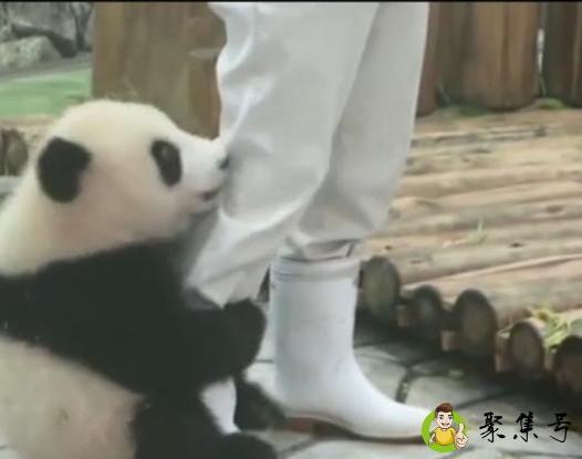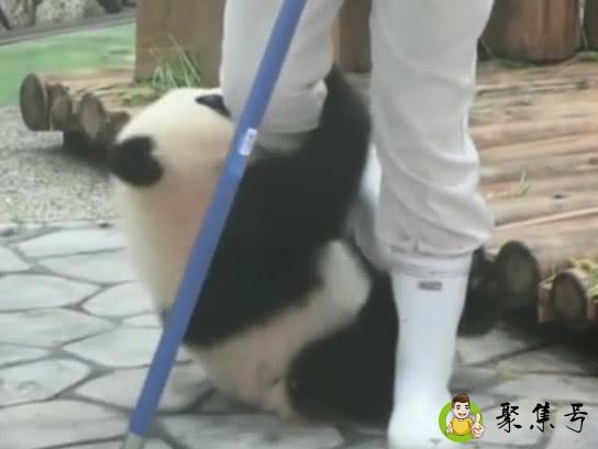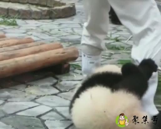 熊猫被放下来以后,还紧紧的抱住饲养员的大腿,怎么也不松开,好像在说,抱抱我吧抱抱我吧,我不要下来走路,我就是要抱。撒撒娇的样子惹饲养饲养员也不忍心,好想再一次把他抱起来,但实在是没有力气了,想转身就走,还拉着棍子吓唬熊猫,再耍赖就打你了。