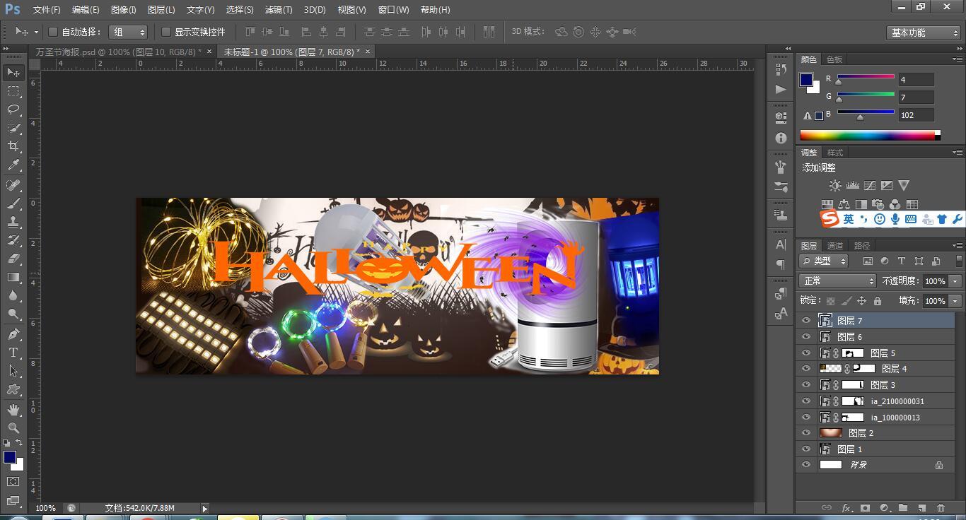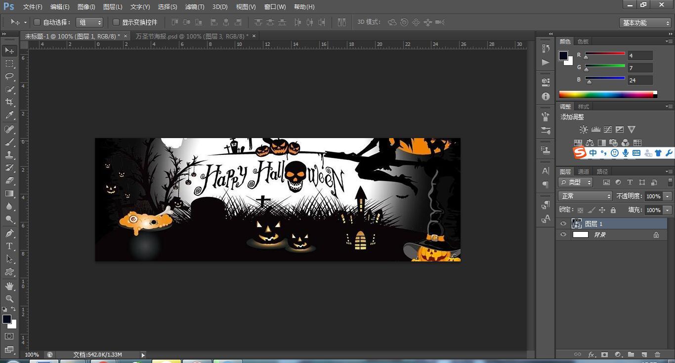 打开ps软件,新建740*250像素画布,使用移动工具拖拉前期先找好素材图片到画布