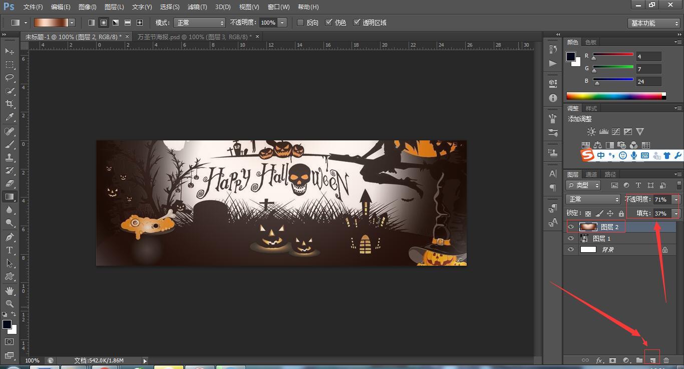 2.“创建新图层”,然后使用渐变工具,设置图层的“不透明度为:71%”,“填充:37%”