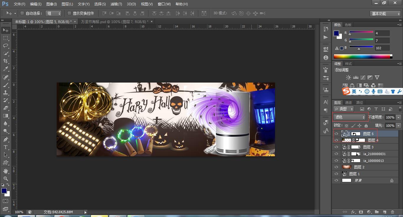 5.同上3的步骤,使用移动工具拖拉前期处理好的图片移动到画布,并将“混合模式”选择为“滤色”