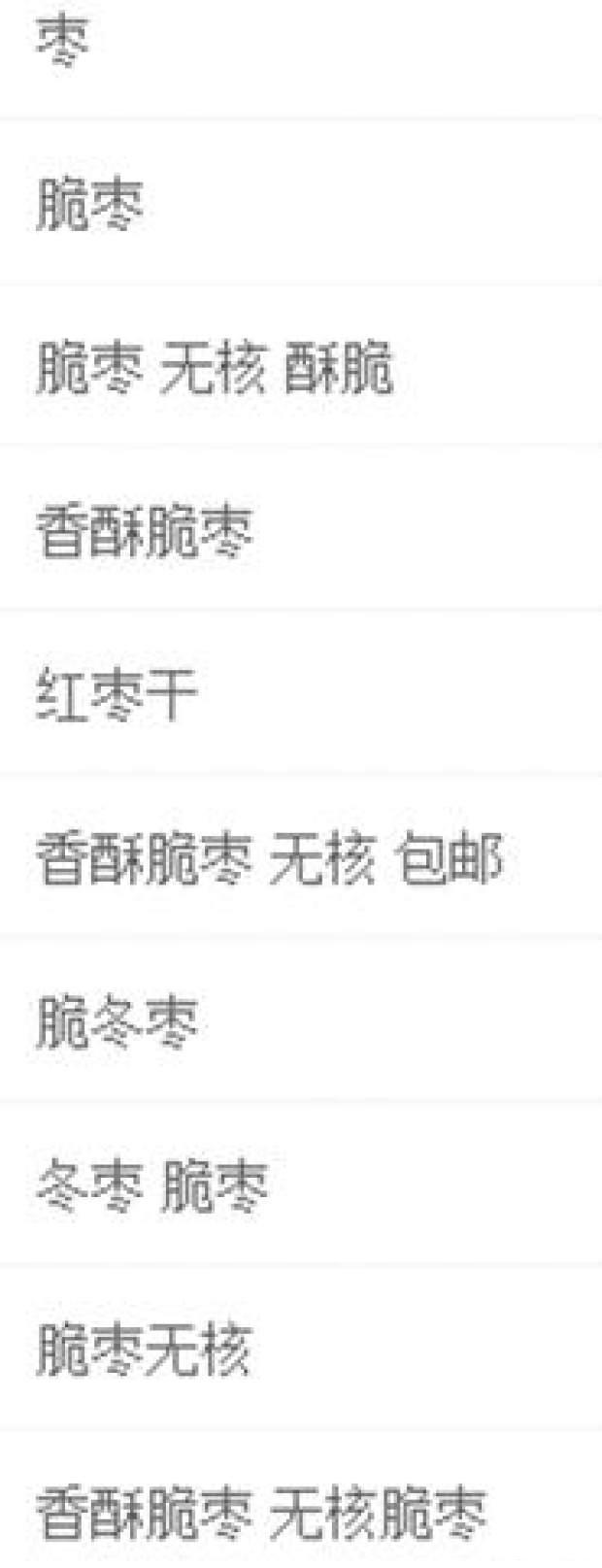 通过进店关键词可以找到对应本店产品突出的卖点!然后表格统计进店关键词,从进店关键词中找到,顾客在意的产品点,发现酥脆、冬枣、无核是消费者进店主要关键词!那么主图就显而易见需要添加,酥脆,冬枣,无核三个关键词!其他类目也相同,将进店关键词进行统计及分析,选取其中顾客比较在意的点,进行突出!