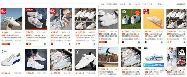 我们可以看到,两个不同的用户搜索出来的小白鞋,弹出来的宝贝排序是不相同的,同样的商品,价格区间和商品本身都有着不同的变化。