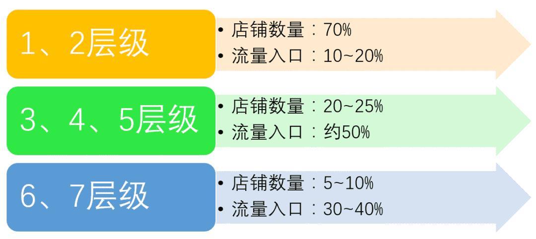 天猫店铺层级的划分是按照店铺数量比例来的,30天销售额最低的40%店铺是第一层级,30天销售额在后40%~70%之间的30%的店铺是第二层级,所以说第一第二层级的商家占到了70%。继续往上,第三四五六七层级的店铺比例大家看下面这个图。要注意的是,不同类目的第5、6层级的比例可能会略有不同。