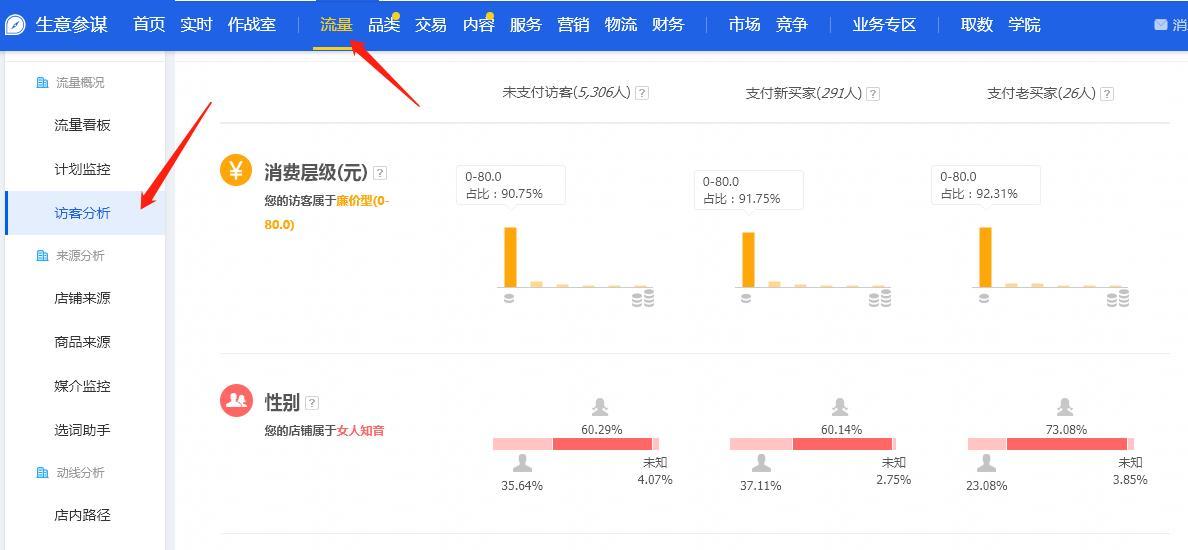 B、如果你是老店,可以直接进入生意参谋后台—点流量—点访客分析,如图所示: